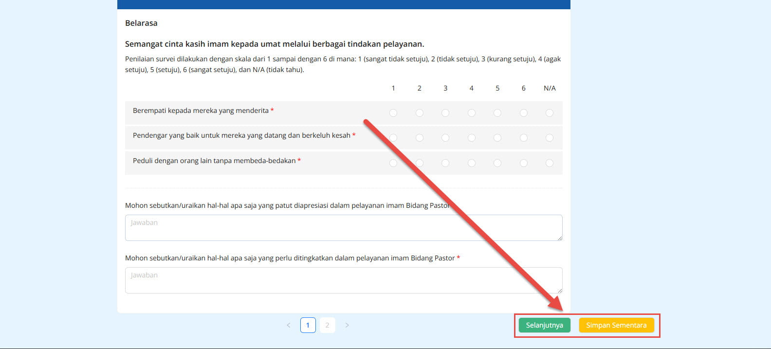 Anda harus kembali ke pertanyaan yang belum diisi dan harap melengkapi jawaban tersebut. Pastikan semua pertanyaan sudah diisi sebelum Anda menekan tombol “Selanjutnya”.