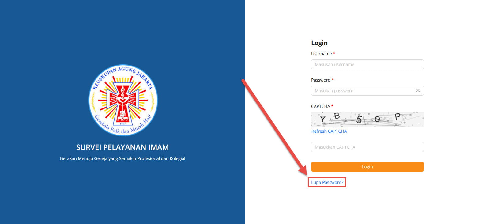 Silakan klik menu "Lupa Password" pada halaman login untuk melakukan reset password, atau hubungi PIC Paroki jika tidak berhasil melakukan reset password.